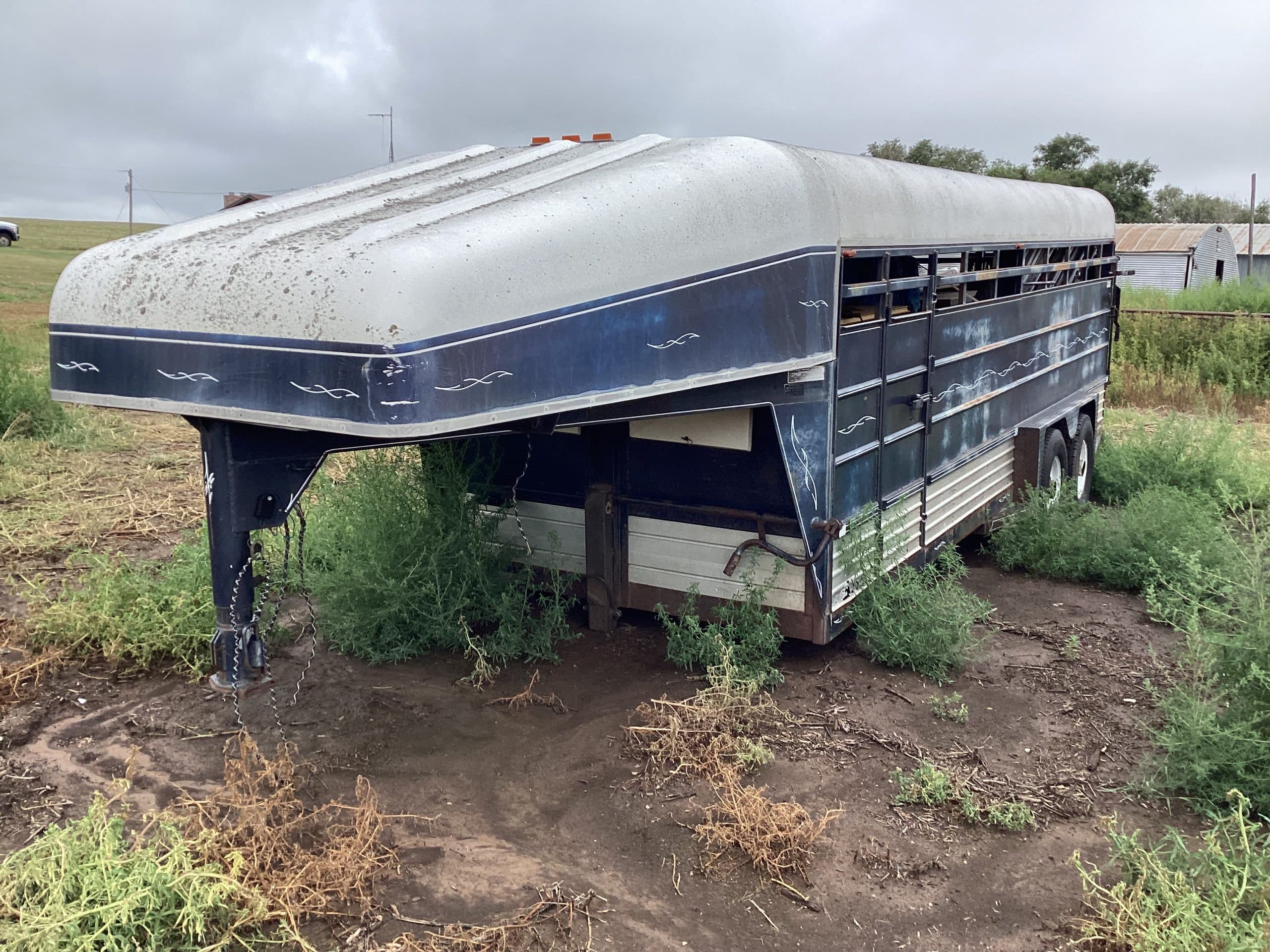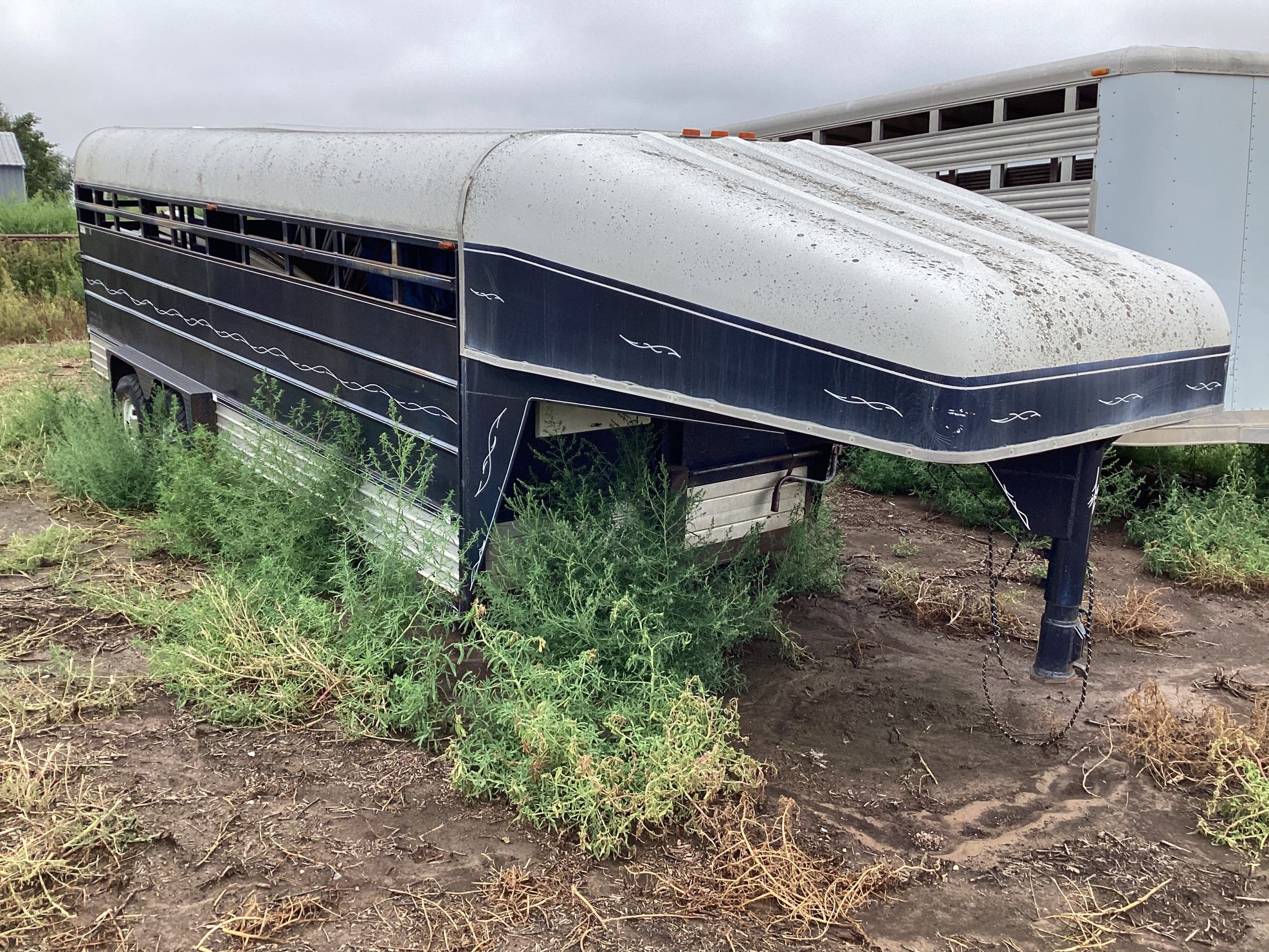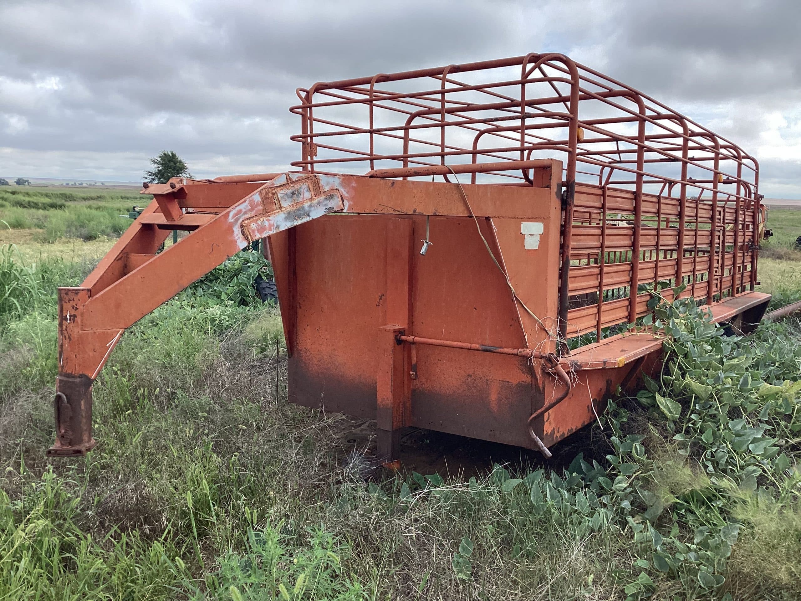 1981 WW gooseneck stock trailer, open top, 6’X20’, wood floor, VIN 091832, needs tires and floor, been in fire
