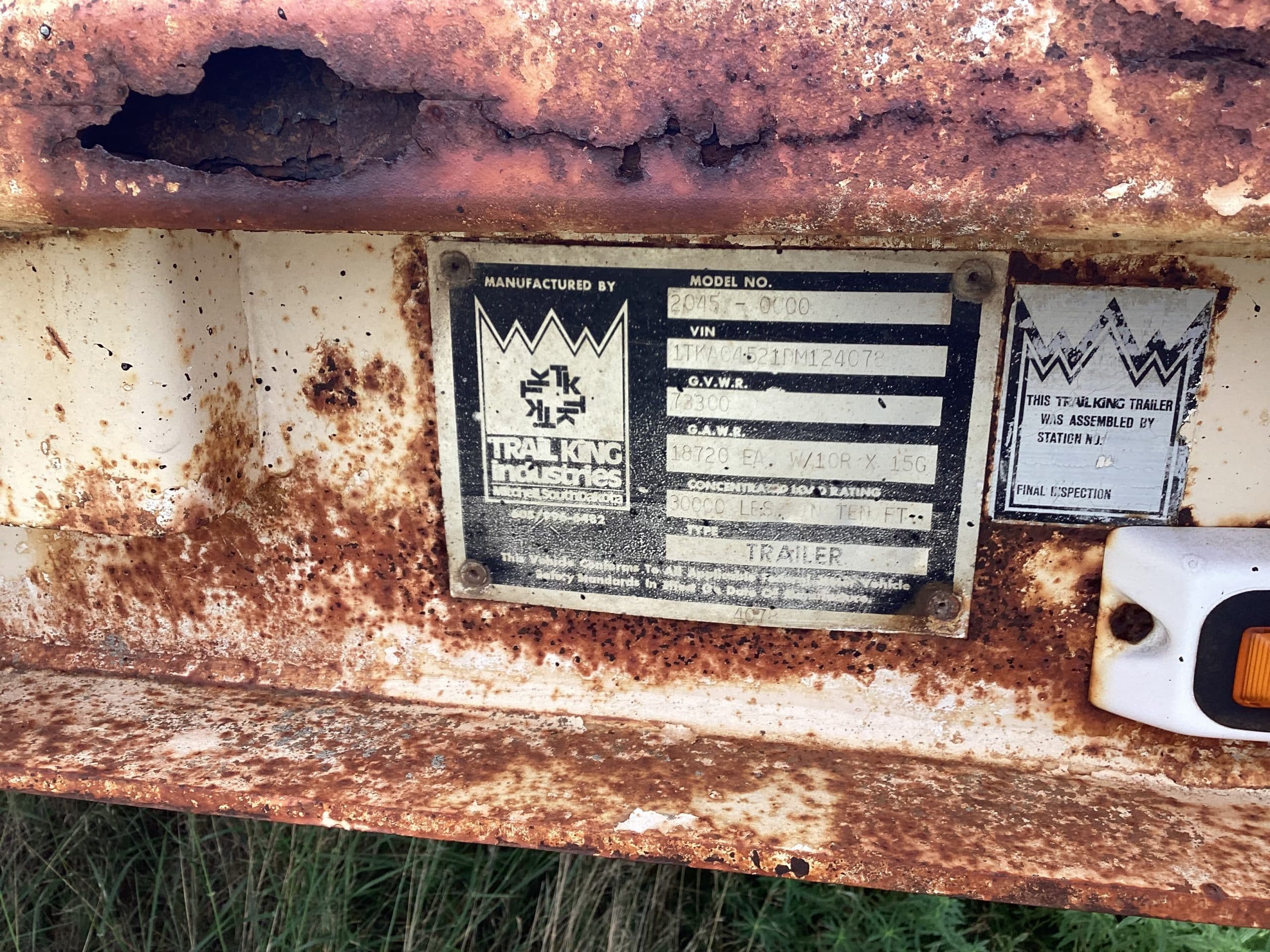 1984 Trail King semi flat trailer, model 2045, VIN 1TKA04521DM124078, 37’ deck, 10’ hyd. ramp