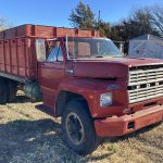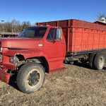 1979 Ford F700 grain truck, Vin: F70HVGJ7555, 4x2speed, gas engine, 16’ steel bed, plumbed for hydraulics, OD shows 27914 miles, front end damage, (Westfield drill fill auger does NOT go with truck)