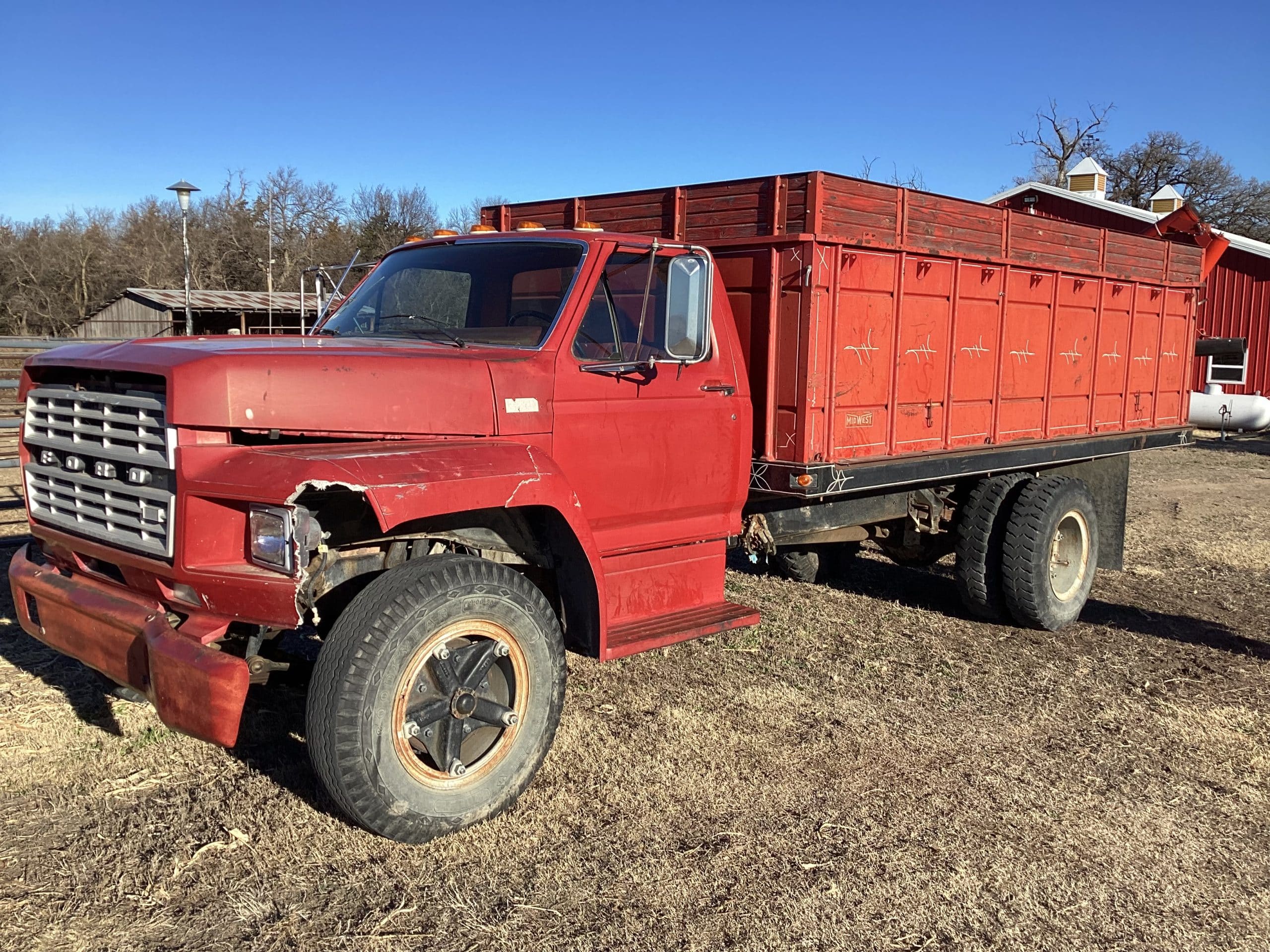 1979 Ford F700 grain truck, Vin: F70HVGJ7555, 4x2speed, gas engine, 16’ steel bed, plumbed for hydraulics, OD shows 27914 miles, front end damage, (Westfield drill fill auger does NOT go with truck)