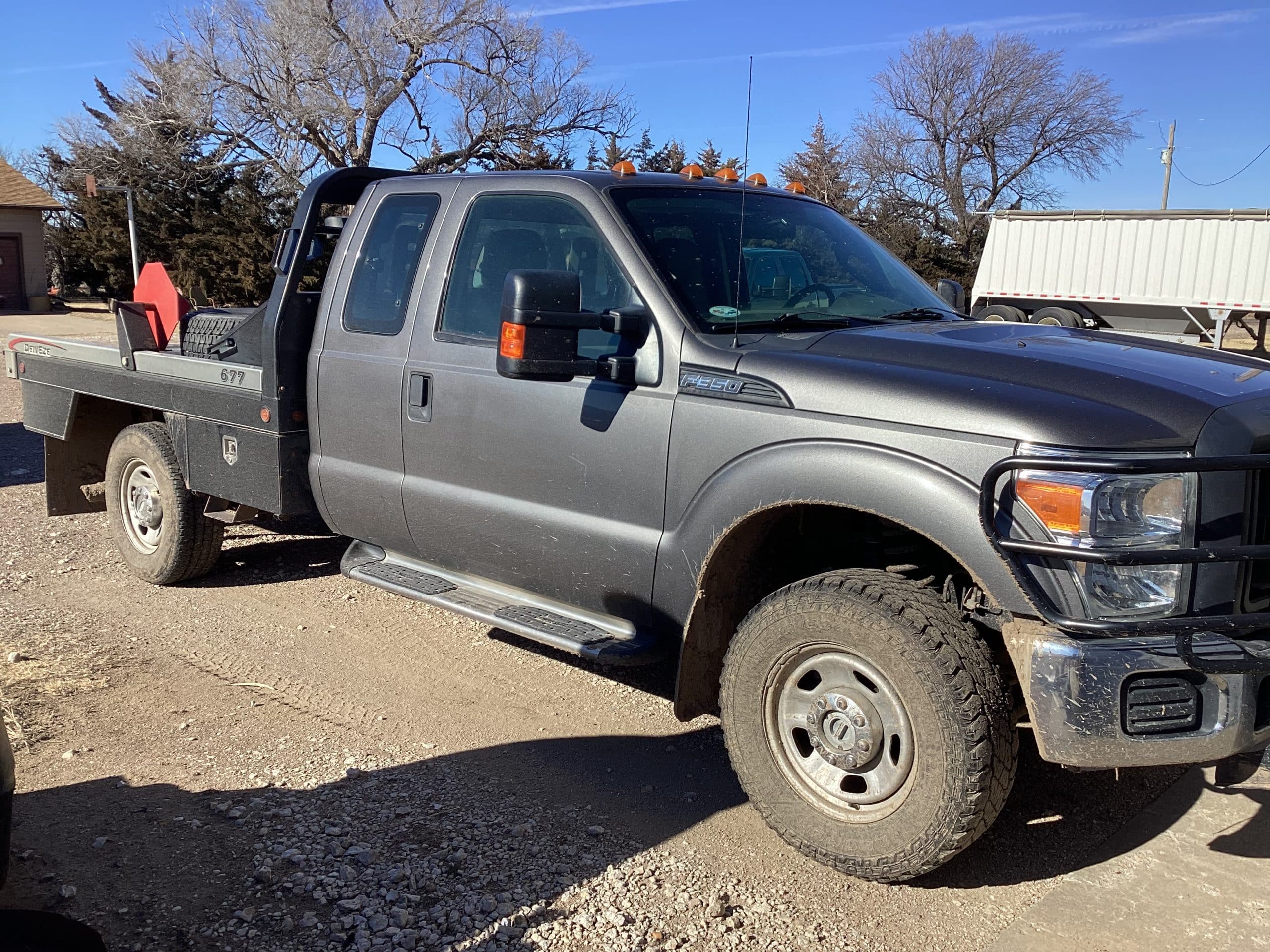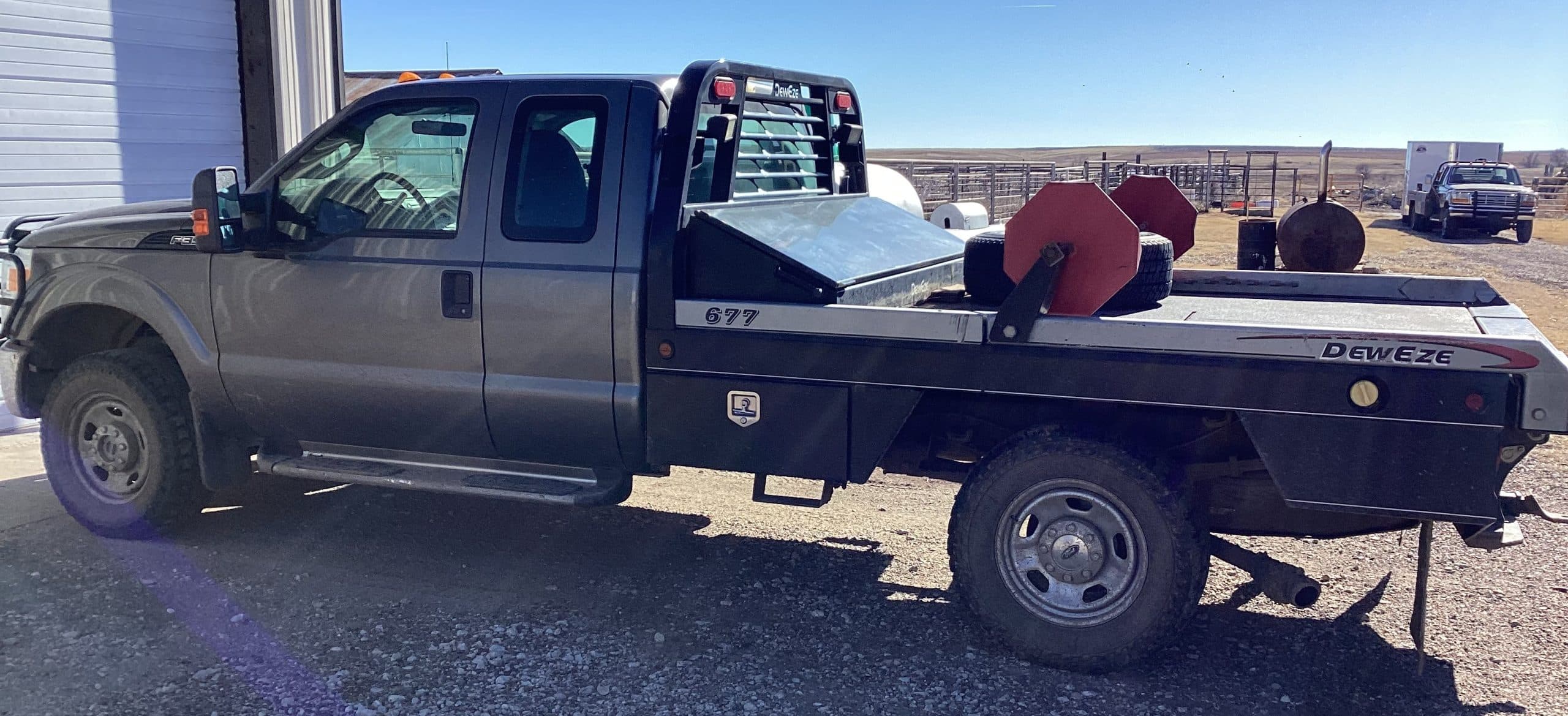 *2012 Ford F350 Super Duty, VIN 1FD8X3F64CEB21726, 98,000 miles, 6.2 gas Eng., extended cab, 4X4, automatic, elec. Windows/locks, grill guard, reg. service, trans. Flush 5,000 miles ago, 677 DewEze bed, elec. Over hyd., remote, toolboxes, gooseneck ball, title