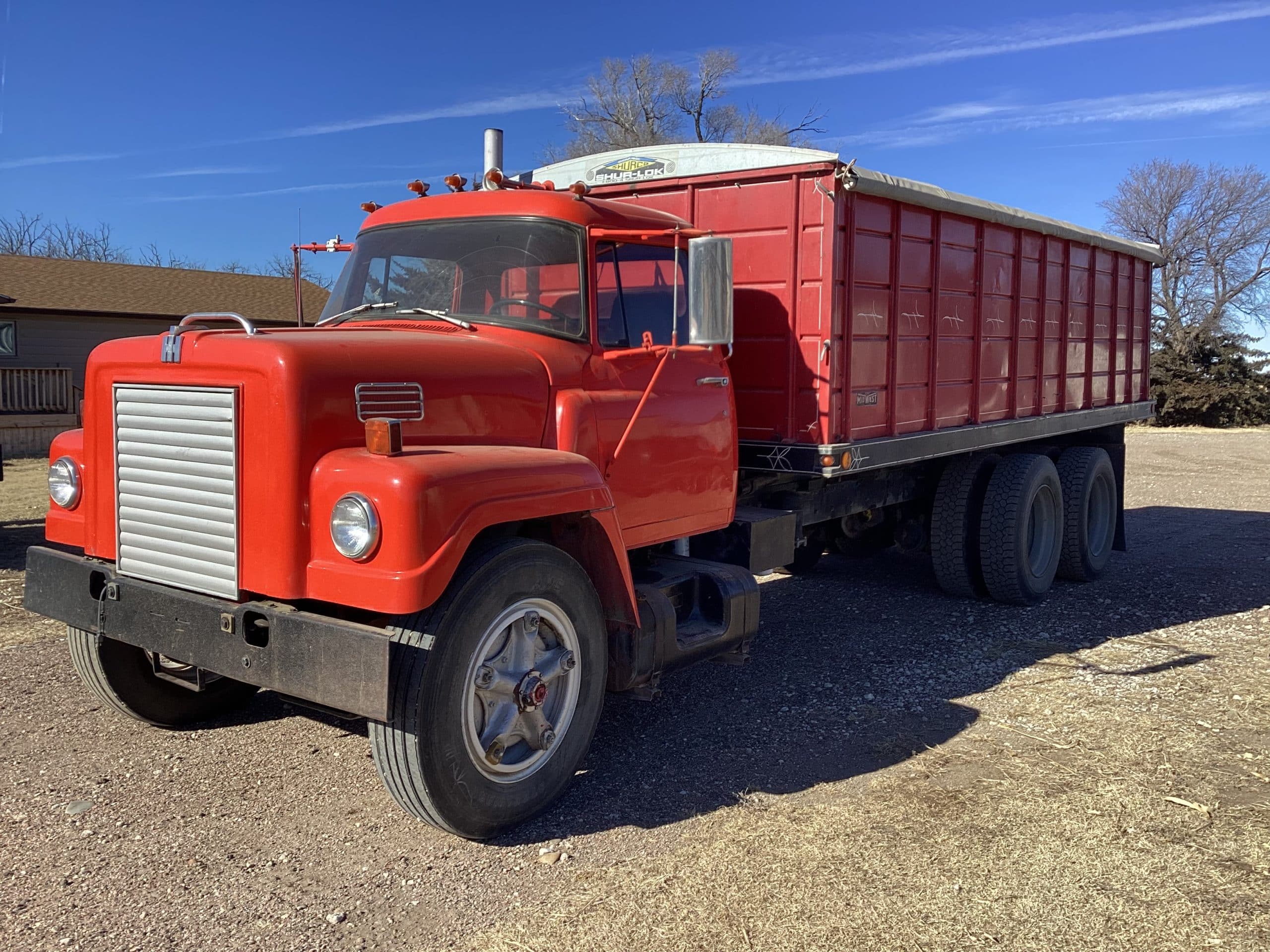*1971 International grain truck, VIN 457240G457072, 250 Cummins Eng., 13 speed transmission, 150 WB, tandem axle, 20’ Midwest bed, 52” sides, steel floor, roll over tarp, plumbed for hyd. drill fill, title