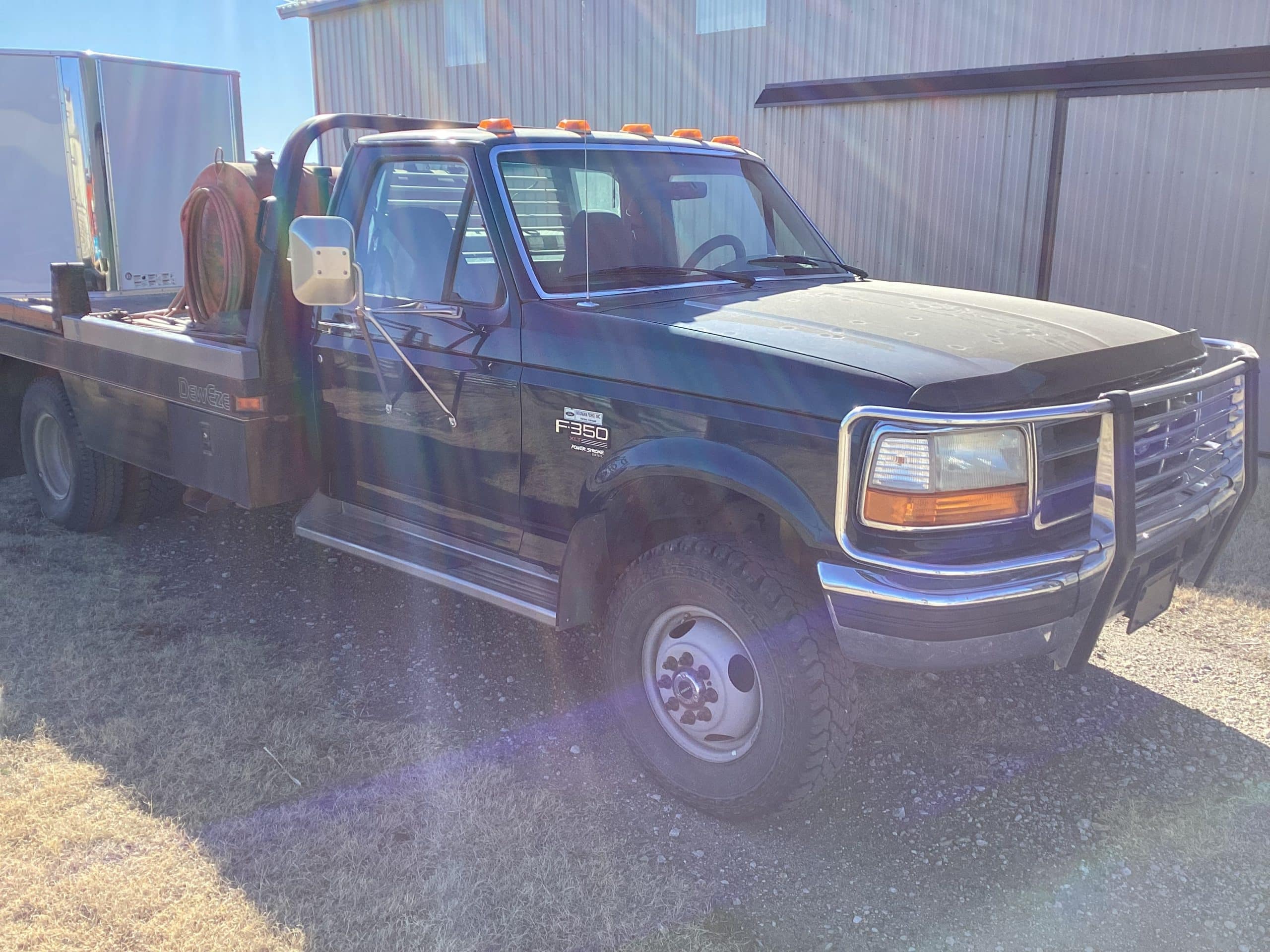 *1997 Ford F350 XLT, VIN 1FDKF38F7VEB11930, 139,407 miles, 7.3 Powerstroke diesel, single cab, 4X4, dually, DewEze 10’ bed, hyd. driven, gooseneck hitch, 5 speed manual transmission, elec. Windows/locks, grill guard, reg. service, title