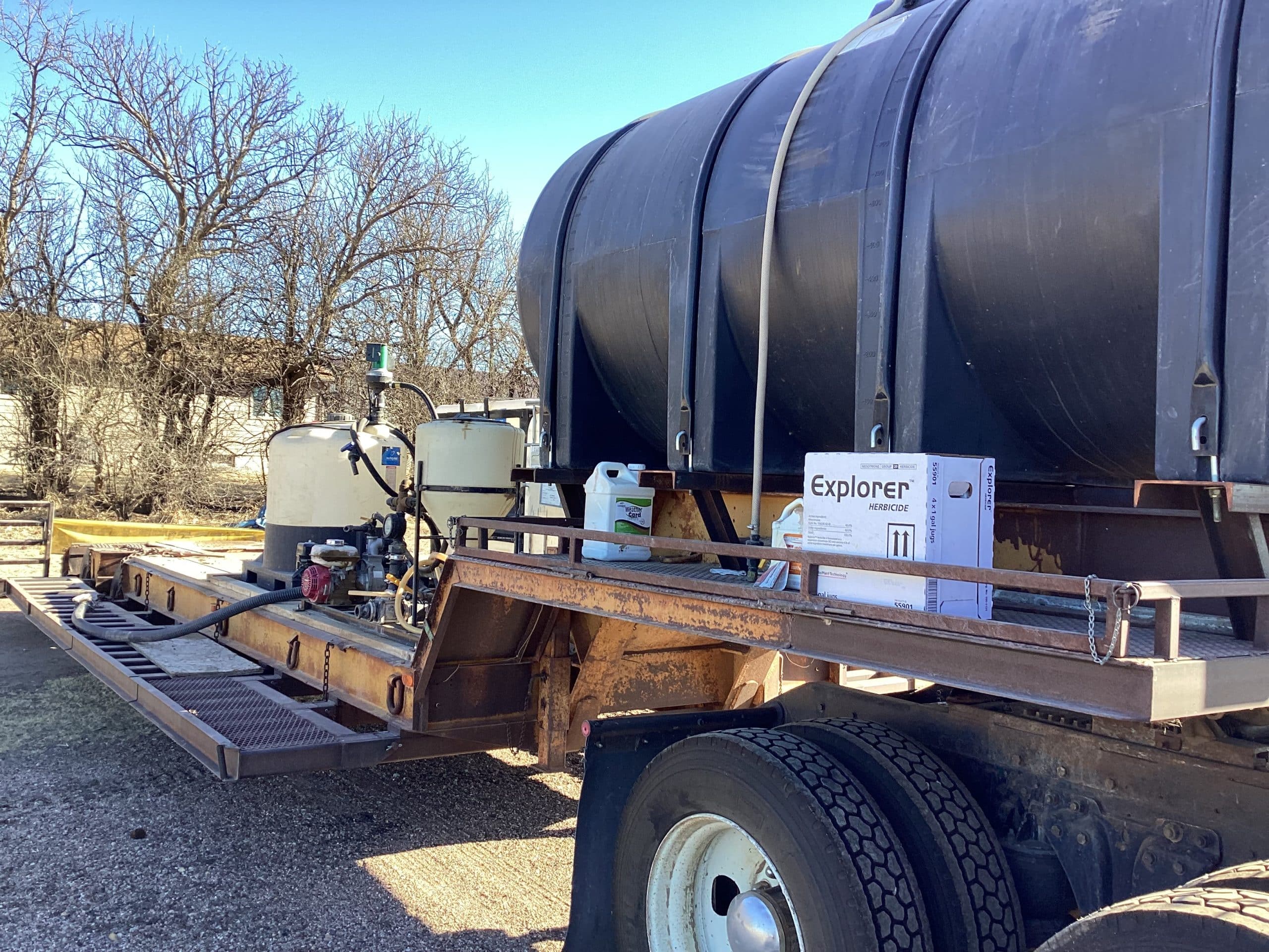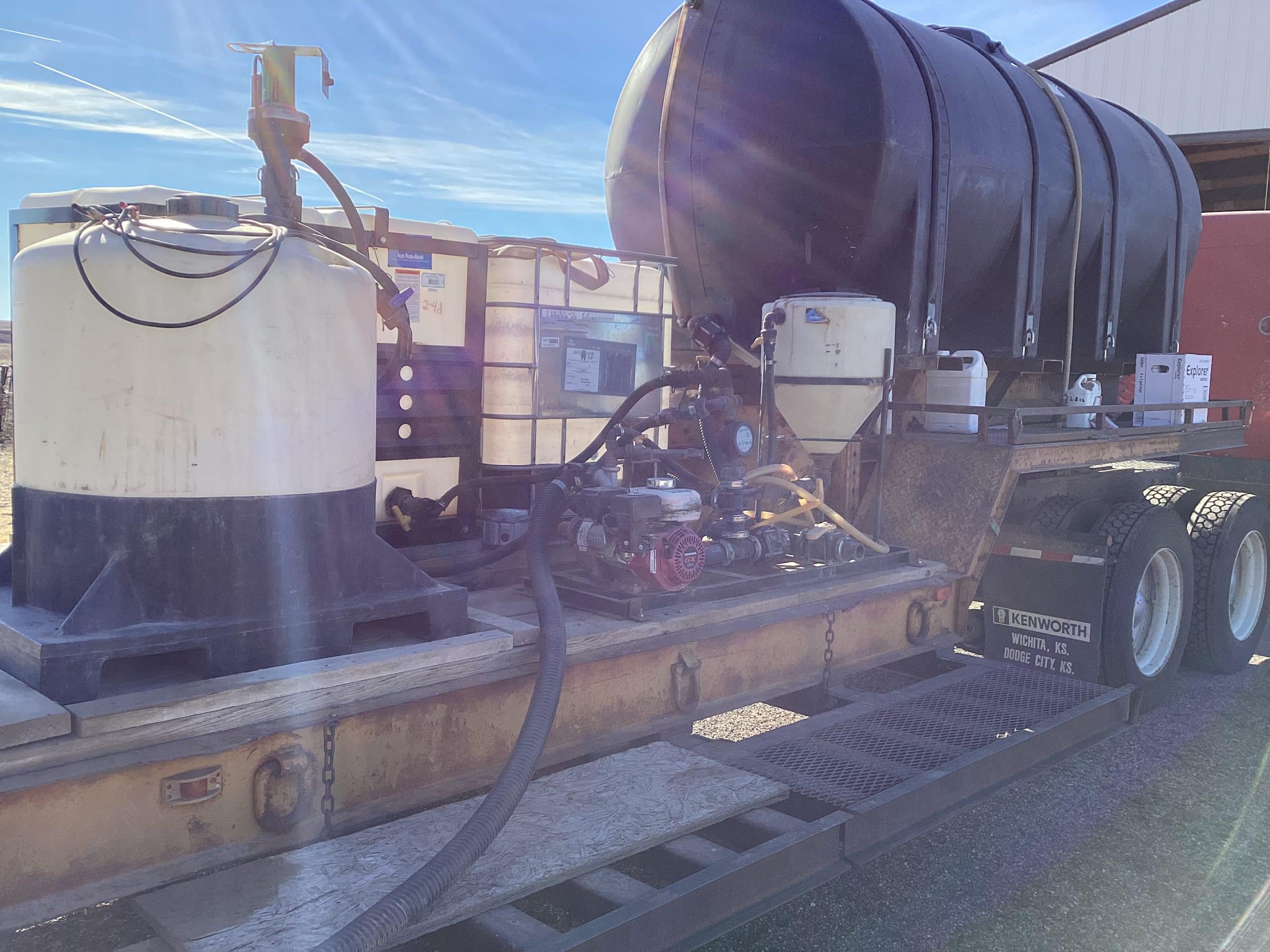 *1972 Load King sprayer/tender trailer, SN 722338, 26’ deck, 8’ wide, folding side extensions makes for 12’ wide, 1,700 gallon tank, mix pumps, Honda Eng., and more, original trailer ramps included, title